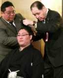 皇風(中)の断髪式で止めばさみを入れる師匠の尾車親方(右)